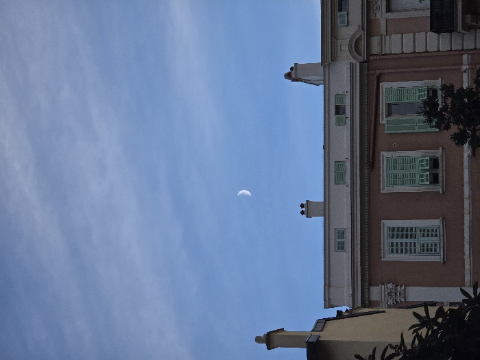 A crescent moon hangs in a pale blue sky. The facade of a building rises on the right side of the frame. Shutters, painted green, adorn the windows set into a reddish-pink wall. A section of a tan-colored building with a chimney is visible at the bottom. Dark foliage peaks in from the right edge of the image. The photo is tilted ninety degrees clockwise.
