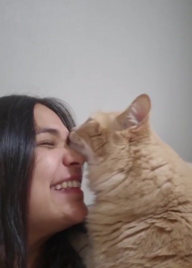 A young woman with long, straight, dark hair is holding a large, pale orange cat against her face. The woman is smiling widely and looking at the camera, while the cat is nuzzling its face against her nose. The background is a plain, light-colored wall.