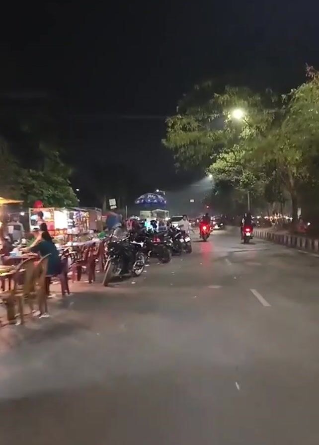 The camera is on a motorcycle, facing forward on a paved road at night. There are several other motorcycles parked on the left, along with food stalls and a few people. Some people are sitting and eating at the stalls, while others are walking across the road. Several motorcycles are driving down the road in the same direction as the camera, their red tail lights visible. Street lights illuminate the scene, and there are trees on either side of the road.