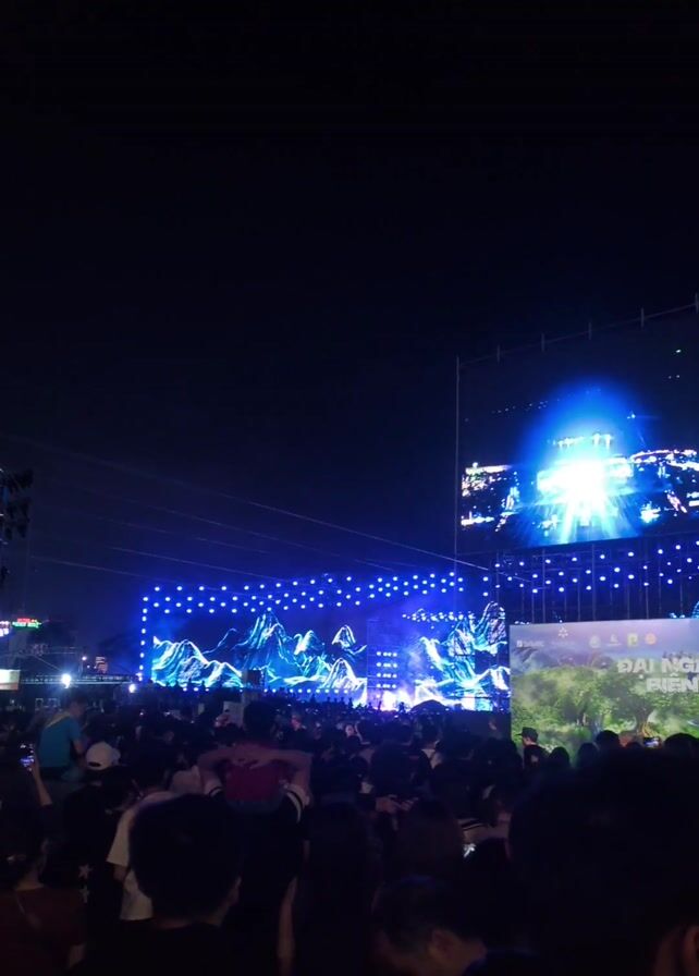 large crowd of people gathered at an outdoor concert at night. A brightly lit stage is visible with a large screen behind it showing a mountain-like design of lights. Another screen to the right of the stage displays a colorful image. Blue laser lights are projected into the crowd. Some people are holding up their phones to record the event. One person is carrying a small child on their shoulders. The sky is dark, suggesting it is late in the evening.