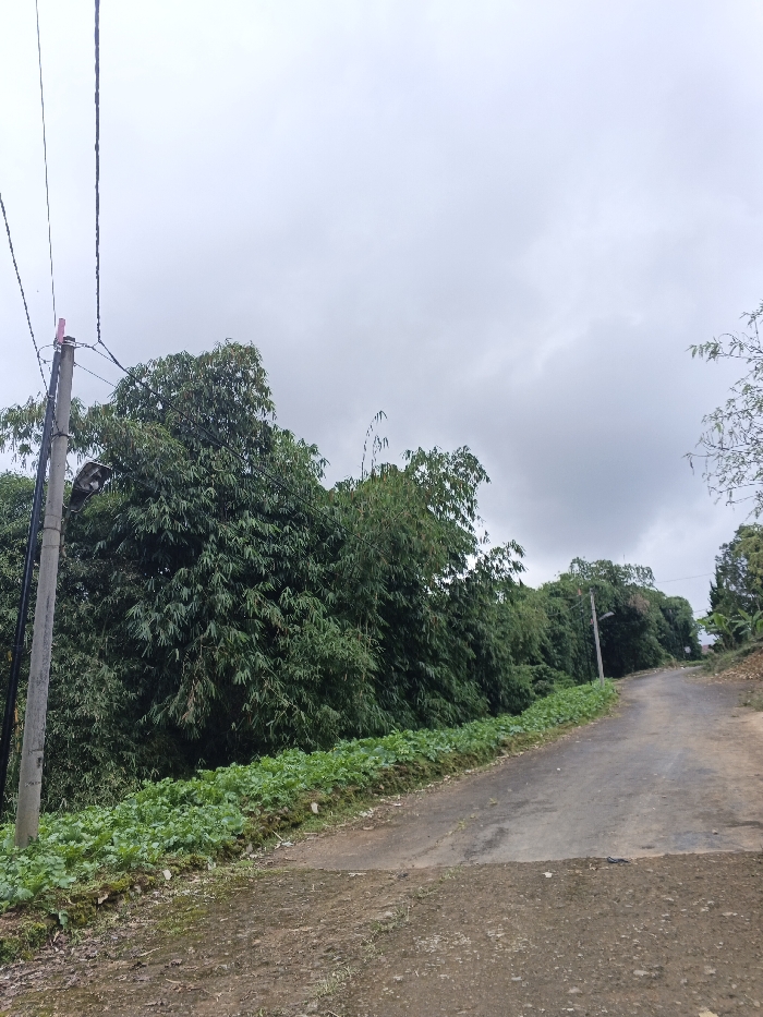 A cloudy sky hangs over a narrow, paved road winding through a lush landscape. Dense green foliage, including tall bamboo, lines the roadside, with lower-lying vegetation hugging the edge of the road. A utility pole with wires stands prominently on the left, adding a touch of civilization to the natural setting. The road itself appears weathered, suggesting rural tranquility.