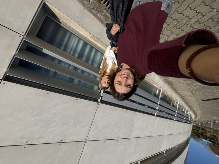 The image depicts two adult females in an outdoor setting in Porto Salvo, Portugal. The subject in the immediate foreground, with brown, wavy hair, wears a maroon long-sleeved top and light-colored trousers. Her left arm is extended towards the camera, suggesting a selfie action, and she exhibits a slight smile. A brown bracelet with copper-colored accents is visible on her left wrist. The second subject, positioned behind and to the right, has long, blonde hair and wears a white long-sleeved top. She carries a dark, patterned jacket over her arm and faces slightly to her right, with her mouth partially open. Both individuals stand on a paver block surface composed of grey-brown interlocking concrete blocks. A metal drainage grate is visible on the pavement near the building's base. The prominent background feature is a modern, curved building with a light grey paneled facade, marked by visible horizontal and vertical seams and rivets. Along the lower section of the building, a horizontal strip of windows is shielded by angled grey external sun louvers. In the far left background, a vegetated hillside with bare trees is visible. The scene is brightly illuminated by direct sunlight under a clear blue sky, indicating daytime conditions.