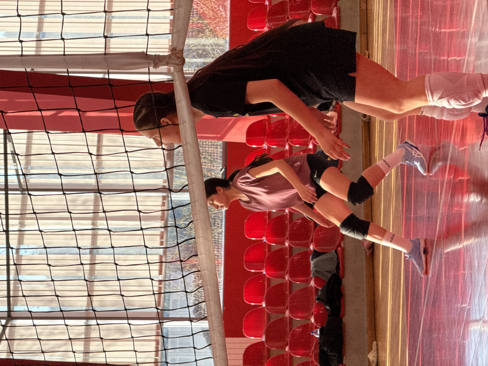 two women playing volleyball in an indoor gymnasium, likely in Etropole, Bulgaria