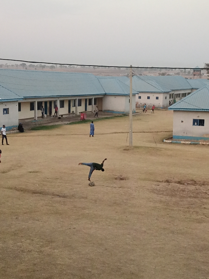 A man balances on a rock in a large, sandy courtyard with buildings on the periphery. The buildings are light-colored with blue roofs and have multiple windows and a covered walkway. Other people are scattered around the courtyard, including some near the buildings and others seemingly playing a game. A utility pole rises in the middle ground. The sky is overcast and hazy.