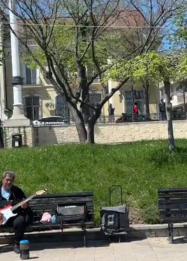 The video captures a sunny day in a park. At the start, a man sits on a bench playing an electric guitar, with his equipment nearby. A bicyclist rides past in the background. The camera pans to reveal an artist displaying and apparently selling portraits under an umbrella, seated beside an easel. The camera continues to pan, showing a lawn and trees. The final shot shows benches with people sitting and walking in the park, under a blue sky.