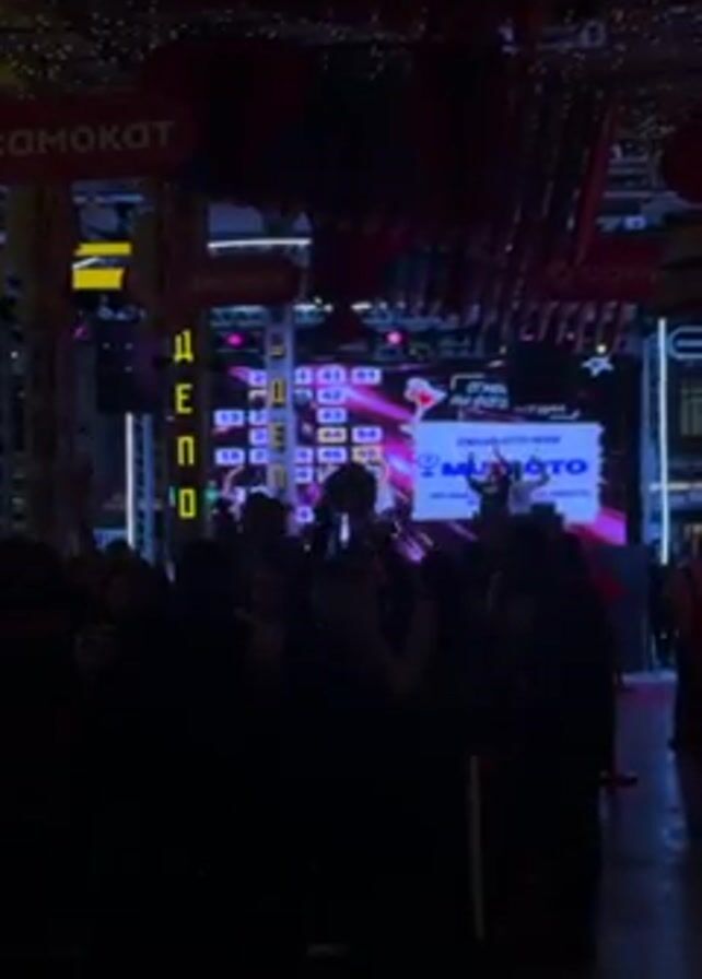 Here's a detailed description of the video: The video captures a scene at an event or gathering indoors, likely at night. The location appears to be a public space, possibly a hall or a commercial area, as indicated by the "самокат" signs hanging from the ceiling. There is a crowd of people facing a stage or a large screen. On the stage, a person is visible in front of a large LED screen. The screen displays what looks like a game or lottery board, with numbers highlighted. The screen also has text, including what appears to be a logo or brand name, "МОЛОТО". The person on stage seems to be gesturing and interacting with the crowd. The people in the crowd have their hands raised, suggesting engagement or excitement. The lighting is dim, with the stage and screen providing the primary light source. This makes it difficult to discern specific details about the individuals or the overall environment. The atmosphere appears lively and energetic, with a sense of participation or engagement among the crowd members and the person on stage.
