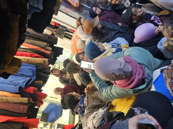 An elevated, downward-angled perspective captures a densely crowded indoor gathering of approximately 20-30 individuals, predominantly women, located in Salé, Morocco. Numerous jackets and coats of various colors (red, blue, brown, black, green) are suspended overhead, forming a canopy. In the mid-ground, a woman wearing a green jacket and a purple head covering holds a white smartphone vertically, its screen illuminated. To her immediate left, a brown cardboard box or bag containing folded clothes is visible. In the background, through a gap in the overhead garments, a section of a room is discernible, featuring a blue sofa and shelving, indicating an interior commercial or communal space. Several women in the background are seated or kneeling, engaged in conversation, with some displaying smiles. The scene is characterized by close proximity of individuals and a profusion of clothing items, suggesting a retail or distribution event.