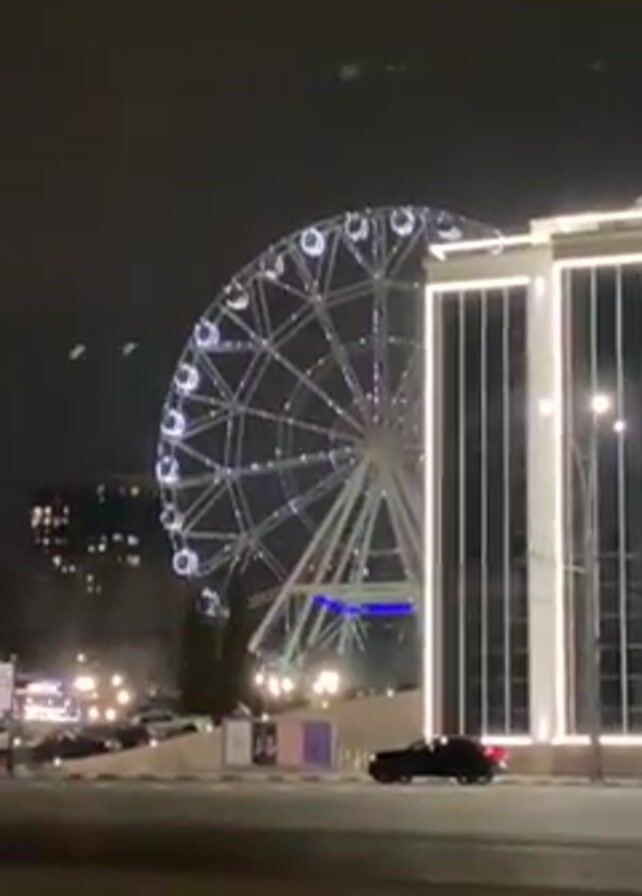 Ferris wheel at night. It is lit up with white lights and slowly spinning. There are a few cars driving on the street in front of it, and a building with vertical lights on the right side of the frame. In the background, one can see a silhouette of other buildings. It appears to be a cold night.