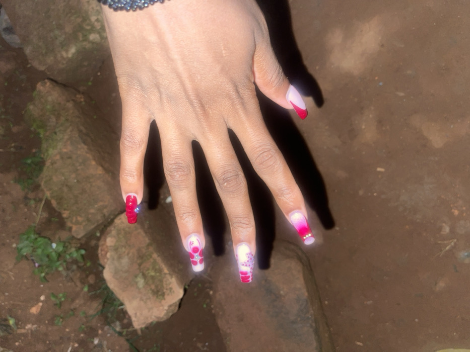 An overhead photograph depicts a single human hand against an outdoor, unpaved ground surface in Kisii, Kenya. The hand, with medium-dark skin tone, is positioned centrally with fingers slightly spread, showcasing elaborately decorated fingernails. The index finger nail is solid red with a single blue/silver stud. The middle finger nail features a white base with red floral patterns and white dots. The ring finger nail displays a pink/purple ombre effect with scattered white dots and small red accents. The pinky finger nail exhibits a pink ombre design with two gold-colored studs near the cuticle. The thumb nail is partly visible, showing a white base with a prominent red V-shape at the tip. A dark, beaded bracelet is partially visible on the wrist. The background consists of reddish-brown earth, with several similarly colored rocks or stones in the upper left, interspersed with sparse green vegetation. Natural lighting casts soft shadows beneath the hand.