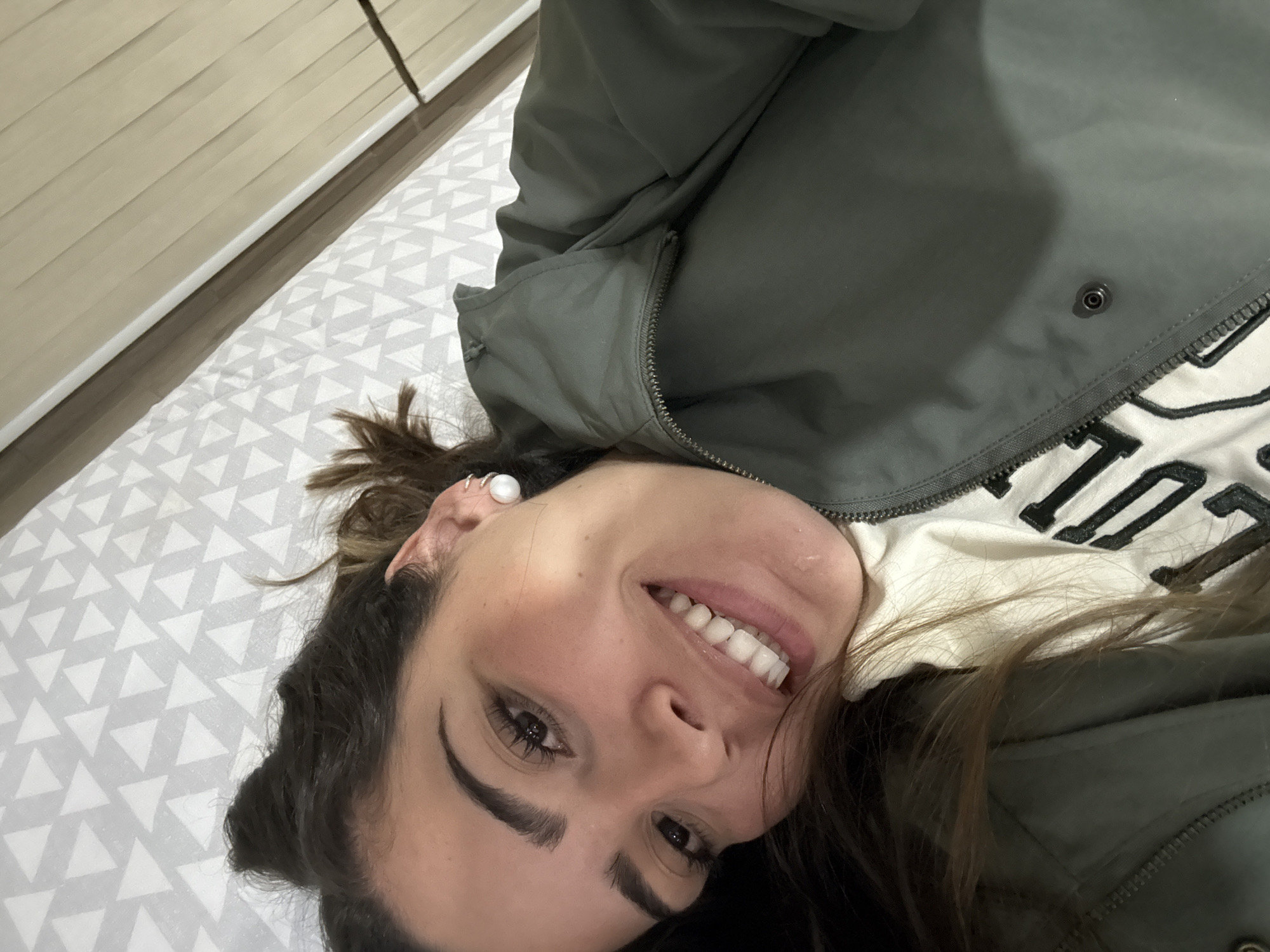 A close-up, tilted portrait depicts an adult female subject positioned on her side, looking directly at the camera with a wide, open-mouthed smile. She has dark brown hair, dark eyebrows, and visible eyelashes. Her right earlobe features a large, spherical, white pearl-like stud earring, with additional smaller metallic rings or studs visible higher on her helix. She is dressed in a partially unzipped dark olive green jacket, worn over a cream-colored garment with dark embroidered lettering, partially visible as "UL". The subject is resting on a surface covered by a light gray fabric patterned with repeating white triangles. In the upper right quadrant of the background, a section of light beige horizontal blinds or shutters is visible, framed by a darker, possibly wooden, edge. No specific visual cues within the image confirm the requested location of Santa Clara Ocoyucan, Mexico.