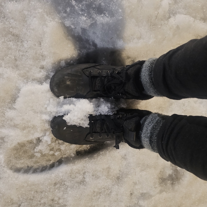 A top-down view shows a person standing in melting snow. They wear dark, lace-up boots with visible footprints around them. Black leggings are tucked into gray and white striped socks above the boots. The snow is slushy and has patches of dirt and water interspersed with the remaining ice crystals. Light reflects off the wet surfaces, highlighting the textured terrain. The person's shadow is faintly visible behind them.