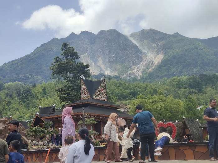 The scene depicts an outdoor recreational or cultural site within an unidentified city in Indonesia, set against a prominent mountainous landscape under a partly cloudy sky. The background is dominated by a large mountain range; its left slope is densely forested with green foliage, while the right slope presents a significant barren, light-colored rocky area marked by visible white streaks, indicative of a volcanic or geothermally active zone. In the mid-ground, a traditional Indonesian building with a distinctive dark, multi-tiered, steeply pitched roof adorned with intricate red, white, and gold patterns is centrally positioned. Various green trees and vegetation surround this structure. The foreground encompasses approximately 15 to 20 individuals, comprising both adults and children, spread across a paved area and along a low, decorative wall constructed from reddish-brown patterned blocks. Adults are dressed in casual attire, with several women wearing headscarves (hijabs). Specific individuals include a woman in a light purple dress and pink hijab looking towards the right; a man in a dark blue shirt with his back partially to the camera, interacting with children in the central area; and another child in light-colored clothing resting or climbing on the low wall near a large red heart-shaped decorative element. Actions observed include standing, walking, and adult-child interactions within a public setting.