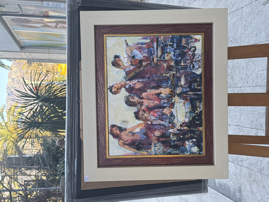 A framed oil painting, rendered in an impressionistic style with vibrant reds, blues, browns, and cream hues, depicts a group of approximately five to six figures engaged in what appears to be a musical performance or social gathering