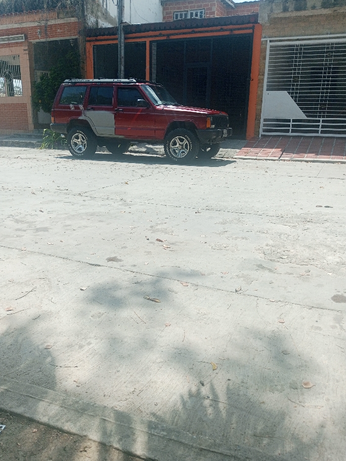 A red Jeep Cherokee stands parked on a concrete street. The front half of the car is red while the rear section is gray. Buildings with barred windows and roll-up garage doors form the backdrop. The concrete street shows shadows from trees and scattered debris.