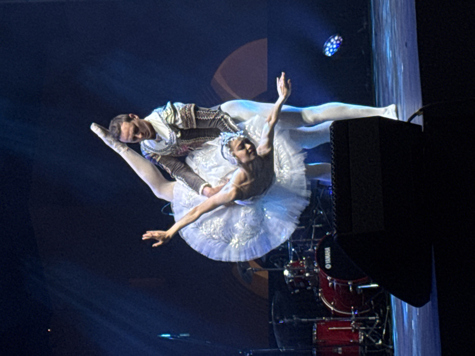 Two ballet dancers in costume perform. A man in a brown and white matador-style outfit supports a woman in a white tutu. The female dancer extends her arm and leg elegantly, while the man balances her. A Yamaha drum set and speaker are visible in the background. The lighting is theatrical, with a spotlight illuminating the dancers and a blue light casting shadows.