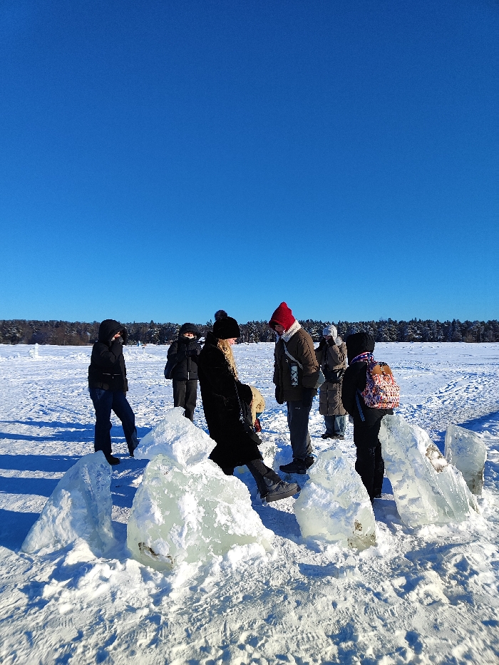 The image captures an outdoor winter scene under a clear, bright blue sky in an unspecified location (Unknown, Unknown). A group of seven individuals is positioned on a vast, flat, snow-covered plain, which extends to a distant horizon line marked by a dense stand of dark evergreen trees. In the immediate foreground, a cluster of approximately seven large, irregular blocks of translucent ice is embedded in the snow. The ground is uniformly covered in white snow, displaying some disturbed areas and footprints. The individuals are dressed in cold-weather attire. From left to right: 1. A person in a dark hooded jacket, blue jeans, and dark boots stands with hands near their face, facing right. 2. A person in a dark hooded jacket and dark pants stands facing generally forward. 3. A female with blonde hair, wearing a black coat, black pompom hat, and dark platform shoes, is leaning forward, looking down at the ice blocks. 4. A person in a brown jacket, grey pants, and a red knitted hat stands facing the blonde female. A white cylindrical object is attached to their side. 5. A person in a light brown long coat and dark hat is partially obscured behind the central figures. 6. A person in a dark hooded jacket, dark pants, a multi-colored geometric-patterned backpack, and a striped scarf stands on the right, looking towards the ice blocks. 7. A seventh person is partially visible on the far right, mostly out of frame. The group appears to be gathered around the ice blocks, with individuals observing or interacting with them. In the far left background, two small, white, indistinct structures are visible on the snowy plain. The scene is illuminated by direct sunlight, casting subtle shadows.
