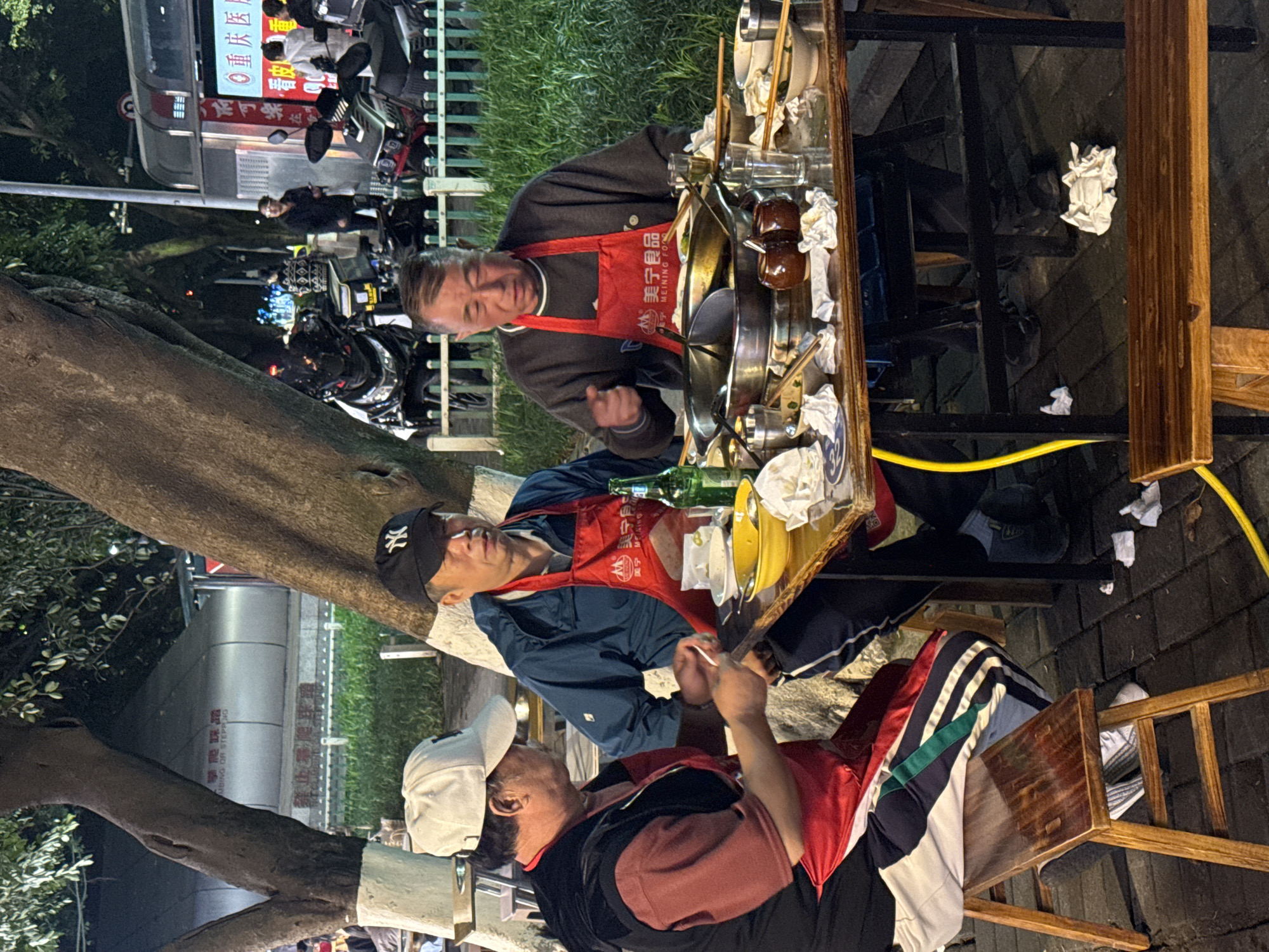 Here's a detailed description of the image: **Scene:** The image shows a street food scene in what appears to be a public area. The scene includes individuals gathered around a makeshift food stall or table. **People:** * Three men are prominently featured. One is wearing a baseball cap, a blue jacket, and a red apron with Chinese characters. Another man is wearing a grey sweater and a red apron. The third man is wearing a baseball cap, a red shirt, and a black and white track suit. * There are other people in the background, standing and near motorbikes. **Objects:** * A wooden table is set up with various cooking utensils, bowls, and what appears to be food. * A bottle of green liquor. * Chairs are positioned around the table. * Motorbikes are parked in the background. * A tree trunk and branches are visible in the foreground and left side of the frame. * In the background, there's a bus stop sign with Chinese characters and what appears to be a bus. **Actions and Interactions:** * The men are seen engaging in conversation and likely involved in the preparation or consumption of food. * The overall atmosphere appears casual and communal. **Environment:** * The setting is outdoors, possibly a park or a pedestrian area. * It seems to be evening or night, given the lighting conditions. * The environment seems slightly urban, as indicated by the presence of the bus stop, motorbikes, and paved surfaces. * The bus stop sign contains the characters for "Chongqing medical." **Location:** * The image includes text indicating the location is within the Yuzhong District of Chongqing, China.
