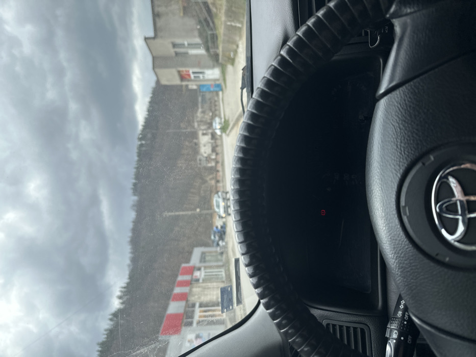 This image depicts a street scene in Gabrovo, Bulgaria, captured from the interior of a vehicle on an overcast day. In the immediate foreground, a black, ribbed steering wheel with a Toyota emblem at its center occupies the lower portion of the frame. The dashboard and instrument cluster are partially visible behind the steering wheel, displaying an illuminated red parking brake indicator. A control stalk is visible on the left side of the steering wheel. The vehicle's windshield is visibly dirty with streaks and particulate matter. On the left side of the paved road ahead, a building with a gray lower facade and a red and white striped upper section is situated, featuring multiple glass door entrances. A blue vehicle is partially parked near this building. Further along the road, a light-colored vehicle is observed in motion. On the right side of the road, a utilitarian gray building with a red door and a visible blue sign is present. A utility pole stands nearby. Multiple other vehicles, including a white or silver car in motion, are observed further down the road. The background features a densely forested hill or mountain range under a heavily clouded, gray sky. No individuals are clearly discernible in the scene.