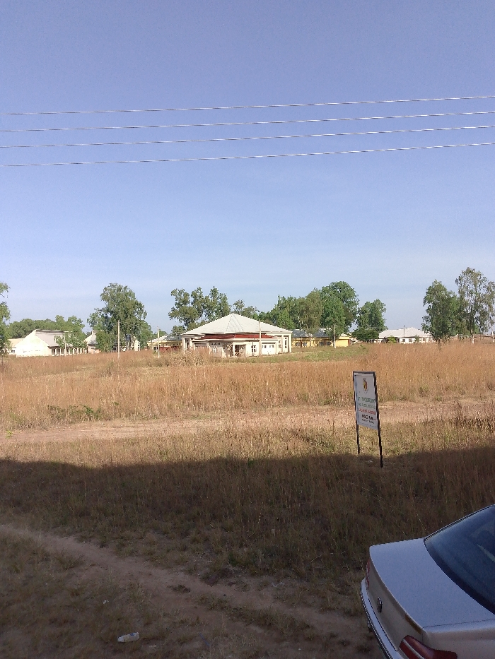 The scene depicts an open area in Ban, Nigeria, under a clear, bright blue sky with four parallel overhead power lines spanning the upper frame. In the immediate foreground, a portion of a silver sedan's rear, including its trunk and left taillight, is visible on the lower right, positioned near a dirt path. A large, dark shadow is cast across the lower half of the field. A rectangular sign with a white background, black frame, and a logo-like graphic at its top stands upright in the dry, light brown, tall grass field, partially obscured by the shadow. The midground consists of this expansive field of dried vegetation, with faint dirt tracks visible. The background features a cluster of single-story buildings and numerous green trees. A prominent, light-colored building with a multi-faceted, light-grey roof is centrally located among other structures of varying white, yellow, and light brown hues. No individuals are present. The scene is illuminated by strong daylight, casting defined shadows.