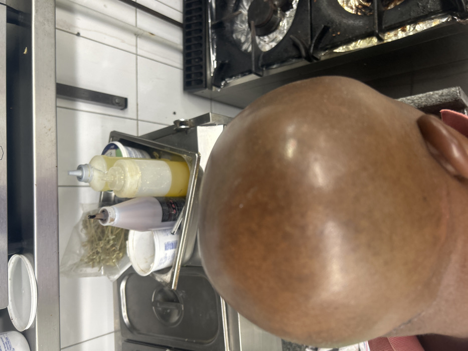 The image depicts a commercial kitchen environment in Hoenheim, France. In the foreground, the bald crown of a person with brown skin is prominently featured, occupying the lower half of the frame. Behind the person's head, a stainless steel counter is visible, on which a metal tray holds several items: two squeeze bottles (one clear containing yellow liquid, one dark brown), two white plastic containers (one with a lid, one open), and a clear plastic bag containing numerous small wooden skewers. To the right of the counter, a portion of a gas stove with two burners, partially covered in aluminum foil, is discernible. The background consists of a white tiled wall and a stainless steel shelf unit mounted above the counter.
