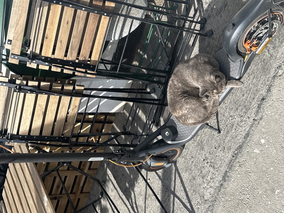 - "An outdoor scene in Budva, Montenegro, features a mottled grey and brown domestic cat sleeping curled on the textured footboard of a dark-colored electric scooter" by FM-R99HH2, licensed under CC BY 4.0