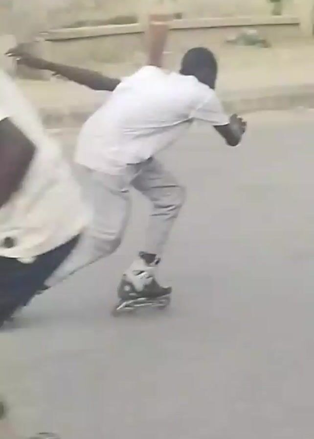 A young person is inline skating on a gray paved road, away from the camera. They are wearing a white t-shirt, gray pants, and inline skates with gray and black boots. They are leaning forward with their arms outstretched for balance. There is a yellow auto rickshaw parked on the side of the road. Another person is filming with a mobile phone. A pair of sandals are on the road. There are trees and low buildings visible in the background.