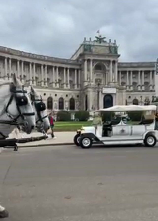 horse-drawn carriage driving past a large, ornate building. The building is light colored and has many windows and columns. Two people are walking near the carriage. The carriage is black and red, and it is being pulled by a white horse. A person is driving the carriage, and there appear to be two passengers. The sky is overcast. There is a small vehicle to the right of the carriage.