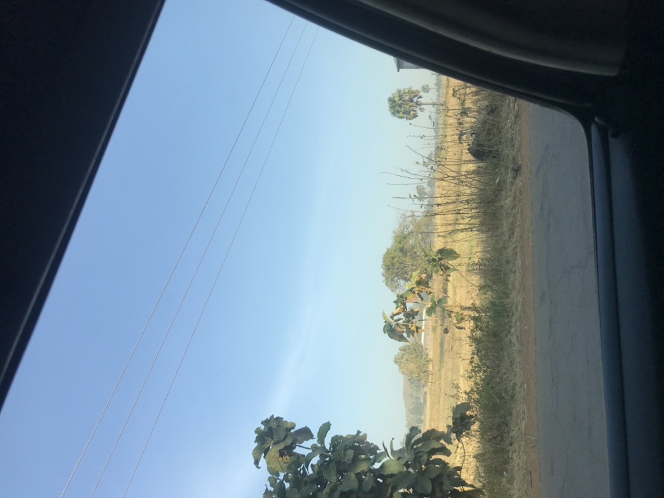 A view from inside a vehicle shows a bright, clear blue sky. Power lines stretch across the sky. Beyond the car window, a rural landscape unfolds with fields of dry grass, scattered trees, and a road. In the distance, faint palm trees are visible. The lower portion of the frame features foliage closer to the viewer, adding depth to the scene.