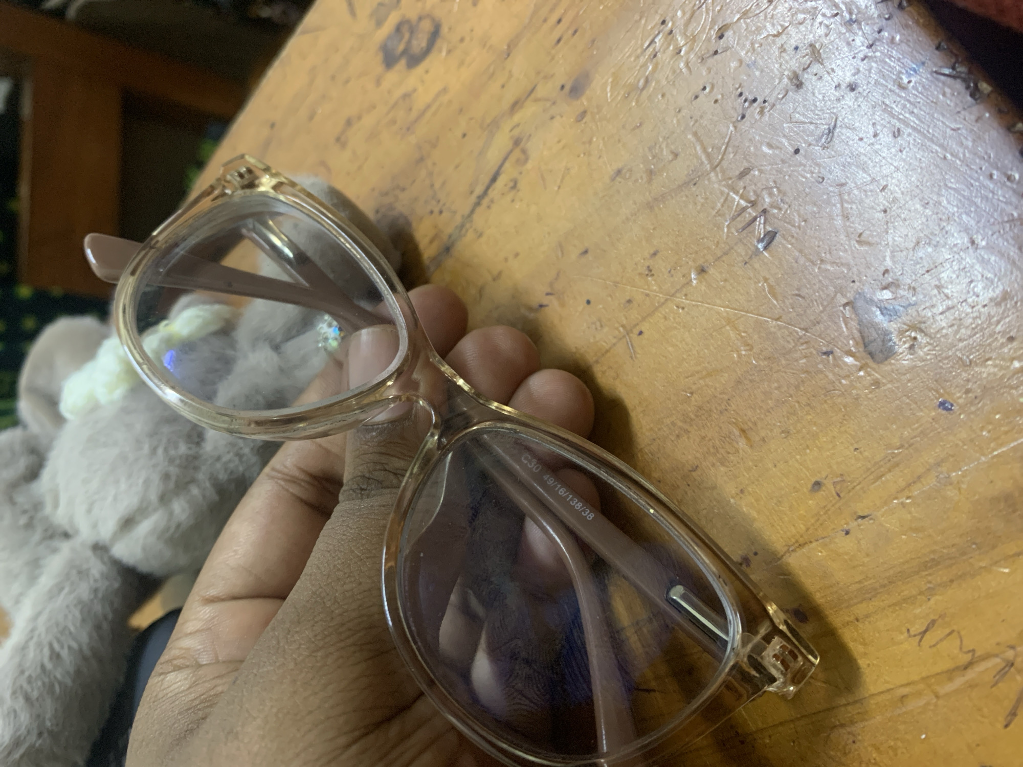 A pair of glasses is held in a hand, set against a worn wooden surface. The glasses have a light brown frame and clear lenses. Text is visible on the inner arm of the glasses, appearing to read "C30 49/16/138/38". A stuffed animal is partially visible in the background, appearing to be a light grey color. The setting does not provide clues about the location in Dar es-Salaam, Tanzania.