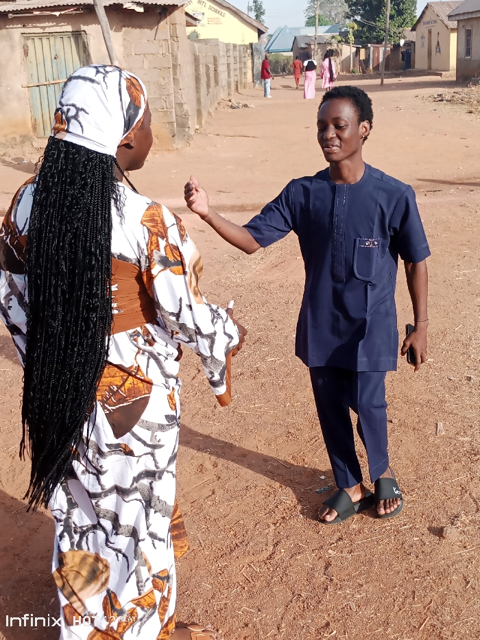 The image depicts an outdoor street scene in the city of Rido, Nigeria, under clear daytime conditions. In the immediate foreground, two individuals are positioned on a reddish-brown dirt road. On the left, a female is seen from behind, wearing a white headscarf with dark patterns, long dark braided hair, and a long white dress patterned with brown, black, and grey elements, cinched with a brown sash. Her right arm is slightly bent, holding a brown cylindrical object. Facing her on the right is a male, wearing a dark blue short-sleeved tunic and matching trousers, along with black slip-on sandals. He has short dark hair, is smiling, and has his right arm raised with an open hand, palm facing forward, while his left hand holds a dark-colored smartphone. The background reveals a continuation of the unpaved dirt road, flanked by various single-story buildings. On the left, a building constructed of concrete blocks features a corrugated metal gate. On the right, further down the road, another concrete block building with a yellow fascia displays partially visible text, possibly "DTL SCHOOLS." Beyond these, additional simple structures are present. Several other individuals, approximately four to five, are visible in the mid-ground, walking or standing further along the road. The sky above is clear and light blue, and bright sunlight casts shadows on the ground.