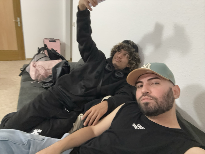 - "Two men are posing for a selfie on a dark grey couch" by FM-WTbt02, licensed under CC BY 4.0