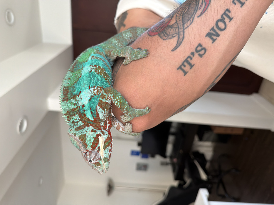 A Panther Chameleon, exhibiting vibrant turquoise, teal, brown, and red markings, is positioned on a human forearm