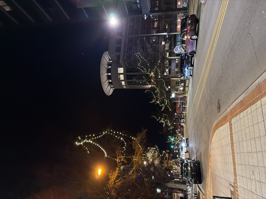 A nighttime street scene features a round building with lights in the upper left. Trees adorned with white lights line the street. Parked cars are visible on the right side of the road, adjacent to a sidewalk paved with light-colored square stones and a brick border. Streetlights illuminate the scene, casting light onto the road.