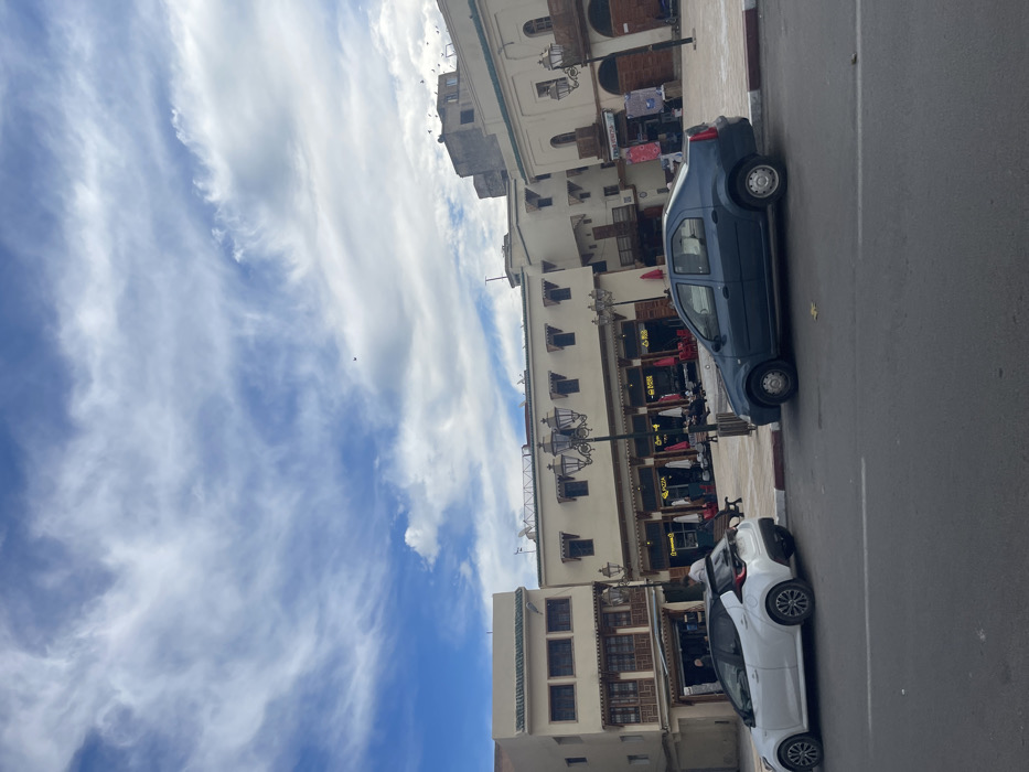 This image captures an urban scene within Mechouar Fes Jdid, Morocco. The setting is an outdoor public square or street, viewed under a partially cloudy blue sky with large, wispy white clouds. Small birds are visible in flight and perched on distant rooftops. A row of multi-story buildings with light-colored (beige/cream) facades defines the background. These structures exhibit traditional Moroccan architectural elements, including wooden window frames, some with balconies, and flat rooftops equipped with visible satellite dishes. The ground level of these buildings hosts several commercial establishments, including visible signage for "PIZZA" and other eateries, which feature outdoor seating areas with red tables and chairs. To the far left, a building displays prominent wooden framed windows and a green-tiled roof accent. On the far right, a building with a dark archway has merchandise, possibly textiles, displayed outside. In the distant background on the right, a darker, fortified-like structure is discernible. In the mid-ground, a light-colored paved public square or pedestrian area is delineated by a red and white painted curb. This curb separates the square from an asphalt road that occupies the immediate foreground. Two ornate, black multi-lantern lampposts are positioned within the square. Two vehicles are present on or adjacent to the asphalt road. On the left, a white modern hatchback is parked or stopped with its rear partially visible and angled towards the curb. On the right, a dark blue/grey sedan is parked or stopped parallel to the curb, with its side profile visible. Several individuals are sparsely distributed within the scene. One person is seated on a public bench in the mid-ground, near the white car. Other figures are indistinctly visible in the outdoor seating areas of the commercial establishments. No specific actions or interactions beyond sitting or standing are clearly identifiable.