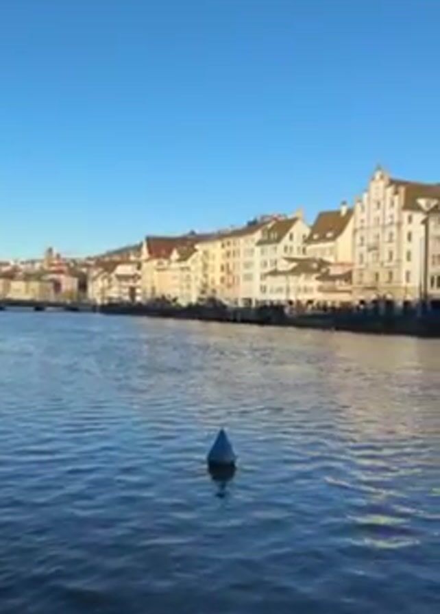 river flowing gently beneath a clear, bright blue sky. The river has a slight rippling effect on its surface and there's a dark blue, conical buoy bobbing in the water. On the riverbank to the right, there is a row of old buildings of various colors and architectural styles. A bridge spans the river in the background, and a tall green spire is visible rising above one of the buildings. The buildings cast a reflection on the water. A faint, white moon is visible in the upper right corner of the frame.