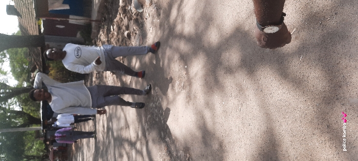 The image depicts an outdoor scene on an unpaved, dirt road in the city of Homa Bay, Kenya, under bright daylight conditions. Two men are walking forward in the mid-ground, while several other individuals are visible further back along the road. The man on the left wears a light grey long-sleeve shirt and dark grey trousers, with black shoes. His right hand is raised to the back of his head/hair, and he is smiling, looking towards the camera's left. The man to his right wears a white long-sleeve shirt with a dark oval-shaped logo on the chest, dark grey trousers, and dark shoes with visible red accents (possibly socks). He walks with his arms at his sides, looking forward. In the background, behind these two individuals, additional people are walking away from the camera. One person wears a grey suit jacket over a purple shirt, while another wears a white shirt. The road surface is light brown, dusty soil with visible small stones and scattered dark shadows, likely from overhead trees. To the right of the road, the ground appears uneven and littered with debris. Buildings with various roof types, including corrugated iron and reddish-brown tiles, are partially visible along the road, suggesting a semi-urban or residential area. Green foliage from trees is visible in the upper background. In the bottom right corner of the frame, a dark-skinned forearm and hand, wearing a watch with a white face and black strap, is partially visible, indicating the presence of another person or the photographer at the immediate foreground.