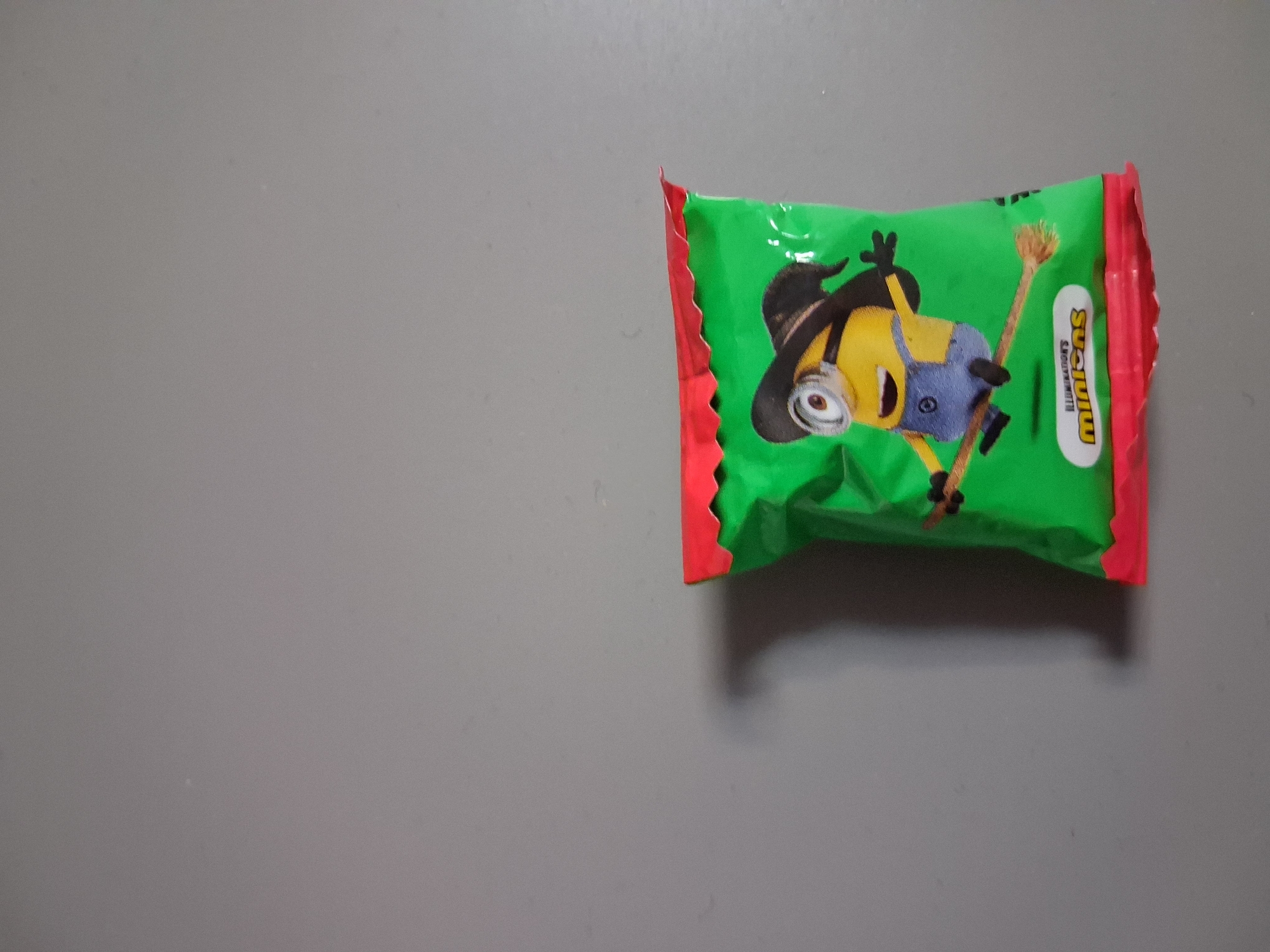A single, crumpled green flexible package with crimped red top and bottom seals rests on a flat, uniform light grey surface. The package features an illustration of a yellow Minion character, wearing a black witch's hat and blue overalls, depicted riding a brown broomstick. Below the character, the text "ILLUMINATION'S minions" is visible in white letters within a white oval with a yellow border. The package exhibits multiple wrinkles and creases. A soft, distinct shadow is cast by the package towards the right and slightly upward, indicating a light source from the upper left. The background is an unadorned light grey surface. No other objects or individuals are present. The scene depicts a static object in an indoor setting. Based on provided context, this scene is located in Varna, Bulgaria.