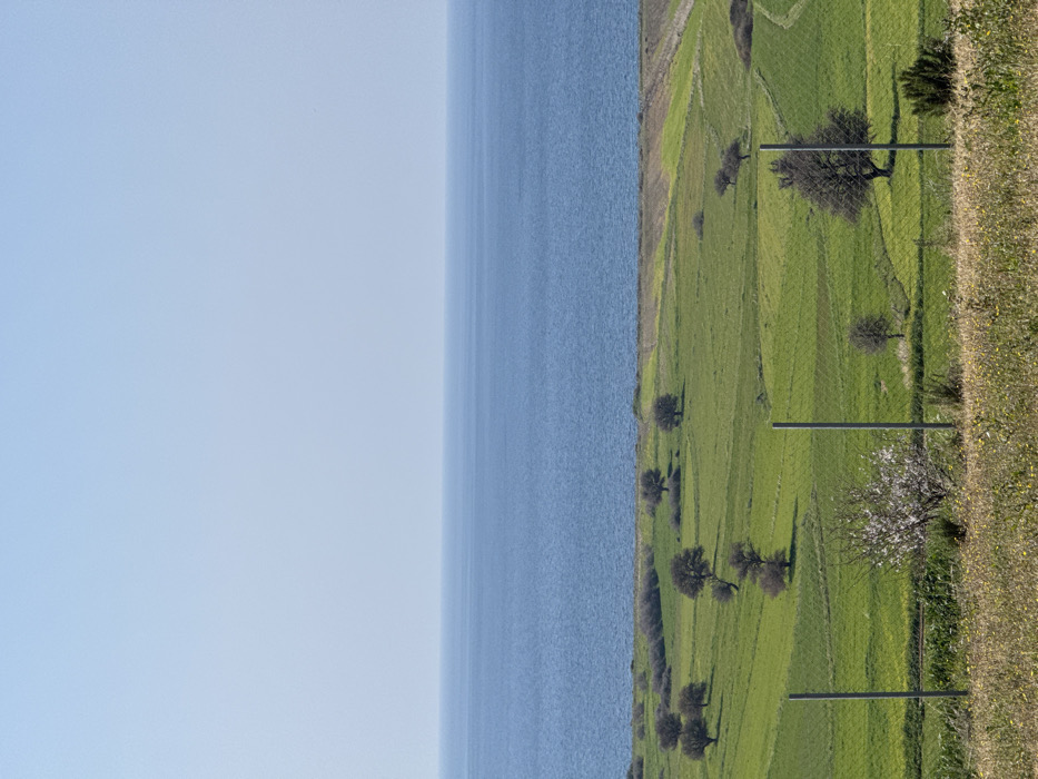 The image displays a coastal landscape in Alonia, Greece. The upper portion of the frame features a clear, pale blue sky. Below this, a calm, deep blue body of water, likely the sea, forms a distinct horizontal line across the middle. The lower two-thirds of the image depict a land area composed of green agricultural fields, some with visible patterns of tilled earth. Numerous deciduous trees, largely bare of leaves, are scattered across these fields. In the immediate foreground, a strip of drier, light brown and green vegetation, interspersed with small yellow wildflowers, is present. Two grey metal fence posts support a wire mesh fence that traverses horizontally across the lower foreground, partially obscuring the view into the fields. A tree with white blossoms is situated directly behind the fence on the left side. No individuals, animals, or active human interactions are depicted in the scene.