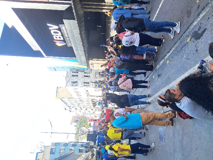 A large crowd gathers in the street next to a building labeled "BDV Banco de Venezuela." The crowd is diverse, with people wearing various colors and styles of clothing. They are standing on the sidewalk and in the street, creating a dense gathering. The background includes other buildings, a streetlight, and trees, suggesting an urban environment. The scene captures a sense of activity and potential anticipation.