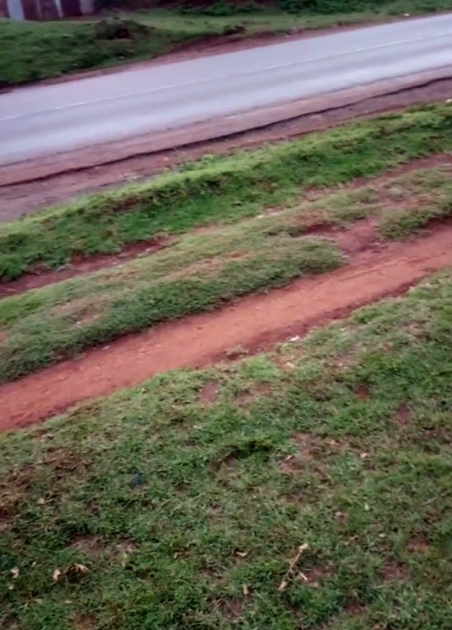 view of a road from an elevated perspective. A road runs along the left side of the frame. It is flanked by green vegetation and patches of red soil. A vehicle, appearing to be a van, drives on the road from left to right. The right side of the frame is predominantly covered with green grass. The camera angle seems to be tilting slightly.