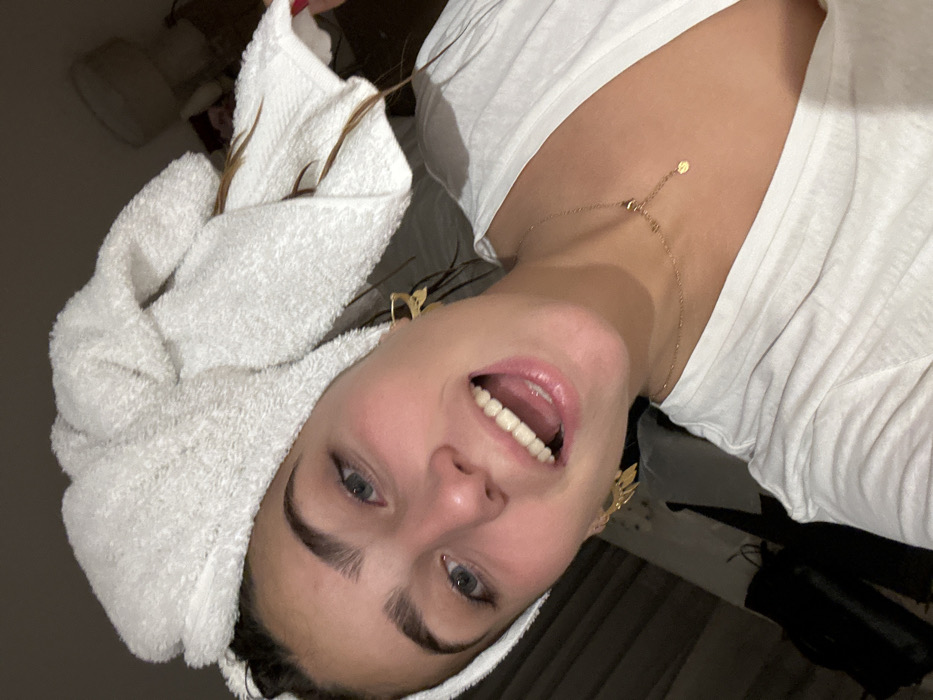 A young female with light skin, blue eyes, and dark eyebrows is depicted from the upper torso upwards, positioned centrally and angled slightly upwards towards the camera in an indoor, dimly lit setting. Her wet, brown hair is wrapped in a white terry cloth towel on her head. She wears a white short-sleeved t-shirt, large gold-colored, leaf-shaped hoop earrings on both ears, and a delicate gold-colored chain necklace with a small circular pendant. Her mouth is open in a wide smile, revealing her teeth, and her eyes are directed towards the camera. A hand with red-painted fingernails is visible near the upper right side of the towel, appearing to hold or adjust it. The background is dark and indistinct, with faint shapes suggesting furniture. This scene is located in Aldoar, Foz do Douro e Nevogilde, Portugal.