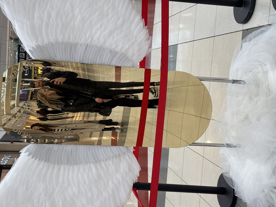 The image depicts an indoor scene within the Big Fashion Podgorica shopping mall in Podgorica, Montenegro. A prominent art installation or display is featured, comprising a tall, gold-toned, reflective, paddle-shaped mirror flanked by two large, white, layered feather-like wings. A mound of white, translucent fabric, possibly tulle, with small embedded white elements, covers the floor at the base of the installation. The display area is cordoned off by two parallel red fabric ropes stretched between black stanchions. Reflected prominently in the mirror are two individuals, a female and a male, standing together facing the display. The female, positioned on the left, has blonde hair and wears a black leather jacket over dark clothing, with a dark shoulder bag. Her hands are clasped at waist level. The male, positioned on the right and slightly behind the female, has a beard and short dark hair, wearing a dark jacket with a light-colored lining visible around the collar. He holds a black smartphone in his right hand, directed towards the mirror, consistent with taking a selfie or photographing their reflection. Both individuals exhibit a slight smile. The background reflection in the mirror reveals a brightly lit shopping mall corridor with light-colored tiled flooring, other pedestrians, and commercial storefronts. Visible store signs in the reflection include "ARFOS" (or a similar variant) and "HEROES LINE," confirming the commercial mall environment.