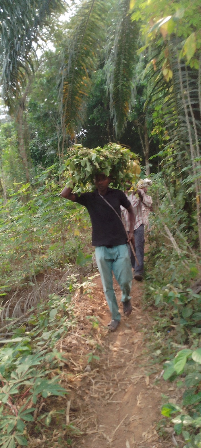 Two men walk along a dirt path in a lush, tropical forest. The first man, in a black shirt and light blue pants, carries a large bundle of leaves on his head. The second man, wearing a light-colored patterned shirt, follows behind with a stick. The path is surrounded by dense vegetation, including trees, bushes, and ground cover. Sunlight filters through the canopy, creating dappled lighting on the path and surrounding foliage.
