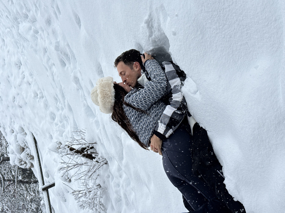 Two individuals, a female and a male, are observed embracing and kissing while lying on a snow-covered incline in Les Allues, France. The female, positioned atop the male, wears a cream-colored fur-trimmed hat, a grey and white patterned knit top, and dark pants, with her dark hair visible. The male lies on his back, partially embedded in the snow, dressed in a black and white checkered shirt over a dark layer. Their arms are wrapped around each other in an embrace. The immediate surroundings consist of deep, undisturbed snow, with snow-laden trees, sparse vegetation, and a partially visible snow-covered wooden fence structure in the upper left background. Small snow particles are present in the air, indicating either light snowfall or disturbed snow, and the scene is under diffused lighting.