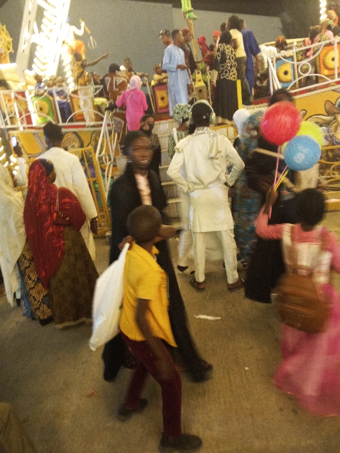 A crowded scene unfolds with numerous people of various ages. A carousel-like ride is visible in the background. Individuals are dressed in a mix of traditional and contemporary clothing. A girl in a pink dress holds balloons. A child in a yellow shirt carries a white bag. The lighting is warm and suggests an evening or indoor setting. The ground appears to be a concrete or paved surface.