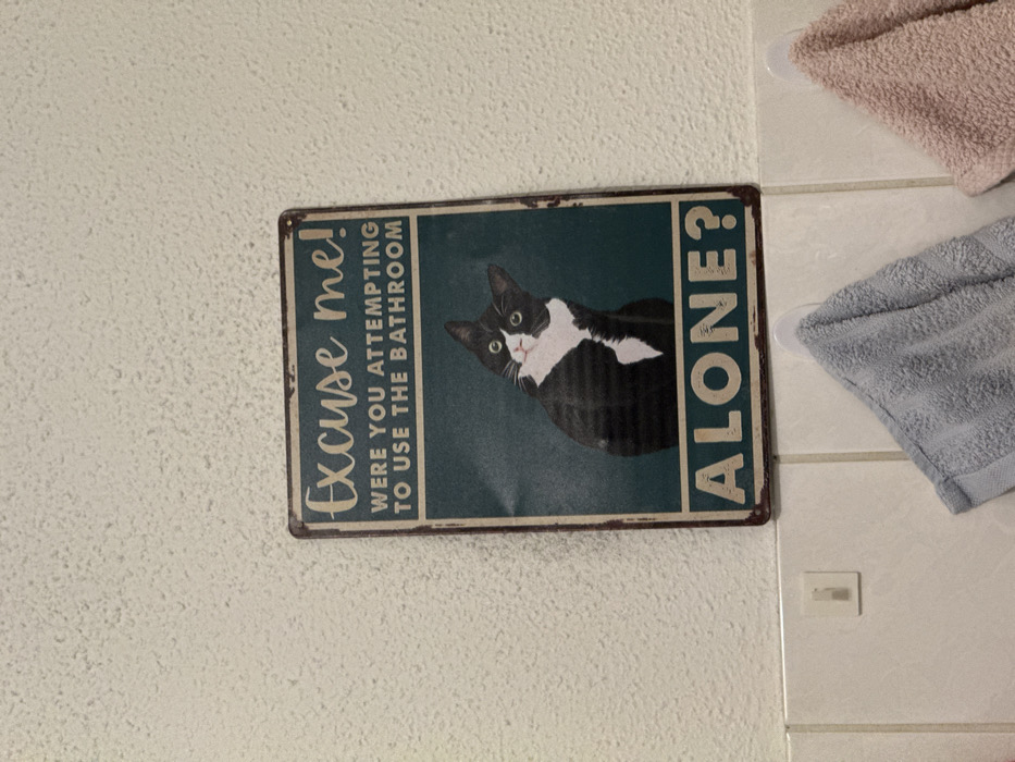 An indoor scene in Strasbourg, France, depicts a rectangular tin sign mounted on a light-colored, textured wall. The sign, featuring a distressed, rusty-effect border, displays a black and white tuxedo cat with wide eyes and a tilted head against a dark teal background. Above the cat, the text reads "Excuse me!" and "WERE YOU ATTEMPTING TO USE THE BATHROOM" in white, capitalized letters. Below the cat, the word "ALONE?" is displayed in similar white, capitalized text. Below the sign, the wall transitions to smooth, light-colored rectangular tiles. Two white adhesive hooks are affixed to these tiles, with a light blue terry cloth hand towel hanging from the left hook, and a light pink terry cloth hand towel partially visible, hanging from the right hook.