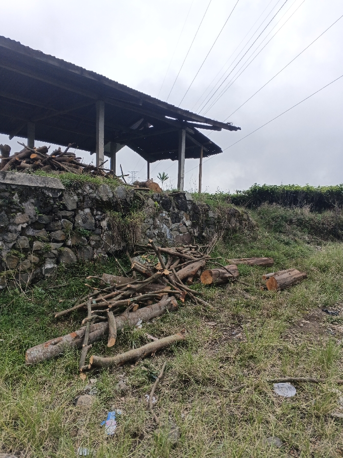 The scene depicts an outdoor environment in Pinnwe, Myanmar (Burma), under an overcast sky. In the upper left quadrant, a dilapidated open-sided shelter with a dark, corrugated metal roof supported by concrete pillars stands on a raised stone wall. Beneath the shelter and on top of the stone wall, a substantial pile of cut logs and branches is accumulated. The stone wall, constructed from rough, dark-colored stones, shows signs of vegetation growth. The foreground and midground are characterized by a grassy, uneven slope. Scattered across this slope is a collection of freshly cut wooden branches and logs of varying sizes. A white plastic bag and other small pieces of refuse are visible among the grass in the lower foreground. In the upper right background, a dense line of dark green foliage extends horizontally. Multiple parallel power lines traverse the sky from the left to the right side of the frame, originating near the shelter structure. A distant power pylon or transmission tower is faintly visible through the shelter's framework. No individuals or active interactions are observed.