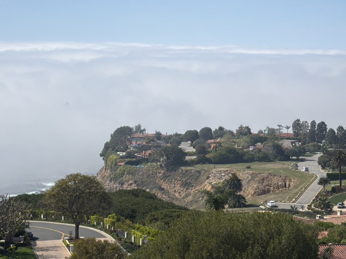 This image presents an elevated view of a coastal residential area in Rancho Palos Verdes, United States of America. A dense marine layer extends horizontally, obscuring the ocean and lower atmospheric features, while a clear blue sky is visible above it. In the foreground, a paved asphalt road, marked with a yellow double-solid line, curves into the lower left. Adjacent to this road, a large, rounded-canopy tree stands amidst manicured landscaping featuring hedges and small decorative pillars. The midground showcases a winding residential street lined with multiple houses characterized by terra cotta tile roofs and light-colored facades, consistent with Mediterranean-style architecture. These residences are interspersed with abundant green vegetation, including various trees such as palm trees. An undeveloped, barren dirt slope is visible between sections of the residential area. Two vehicles are present on the winding street: a white SUV or sedan in the lower left section and a lighter-colored van or truck further along the road. To the left, structures are built atop a steep, eroded cliff face, with the ocean visible below where white waves break against the shore, partially obscured by the marine layer. A small, dark, unidentifiable speck is discernible within the marine layer in the upper-left quadrant. No individuals are depicted in the scene.
