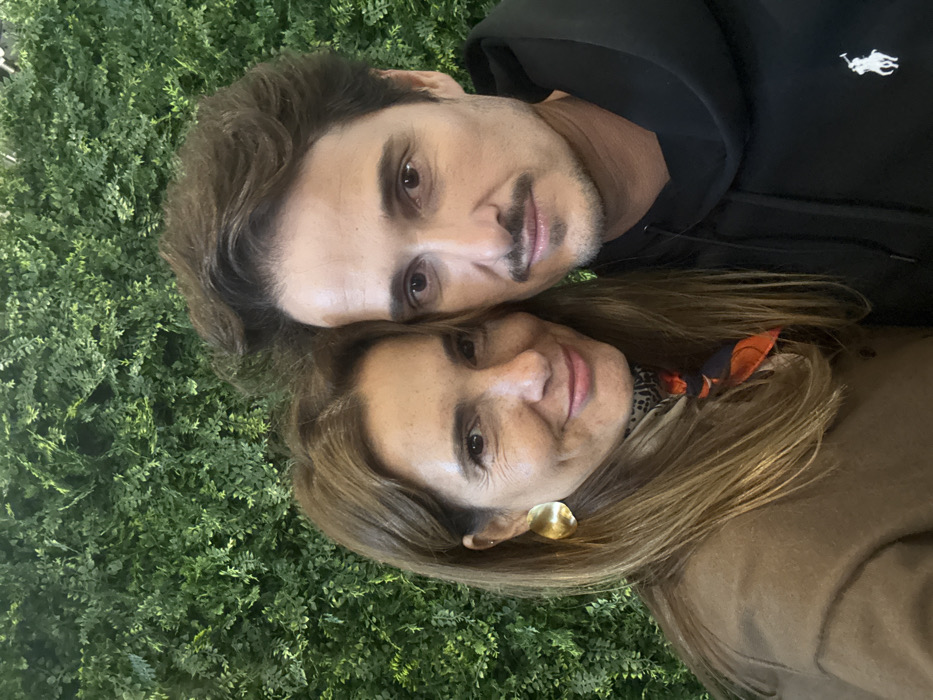 Two adults, a female and a male, are depicted in a close-up selfie-style photograph, positioned with their heads close together and smiling subtly towards the camera. The female, with long brown hair, wears a brown-toned coat, a patterned scarf featuring orange, blue, white, and black geometric designs, and a large, irregular gold-toned earring on her visible left ear. The male, with dark brown hair, a mustache, and a short beard, wears a black hooded sweatshirt with a white Ralph Lauren polo player logo on the left chest. The background consists of a dense, textured wall of artificial green foliage, suggesting an indoor or semi-enclosed environment. While the prompt specifies the location as Chassieu, France, no identifiable markers within the image visually confirm this specific city or a precise address within it.