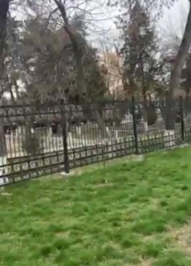 The camera moves along a paved walkway in a park-like setting. To the right of the path are parked cars and trees, and to the left is a grassy area bordered by a decorative black fence. Behind the fence, there is what appears to be a graveyard or memorial garden with trees and white stone structures. The weather appears overcast. There is no one visible on the path.